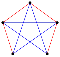 Reciprocamente, é possível 2-colorir um K5 sem criar qualquer K3 monocromático, mostrando que R(3,3) > 5. A única coloração é mostrada a direita. Então R(3,3) = 6.
