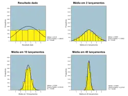 A figura mostra as médias para dois, cinco, dez, vinte e quarenta lançamentos, experimentos realizados 10 mil vezes cada um.