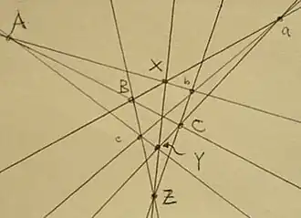 Dado um conjunto de linhas concorrentes A, B, C, e um outro conjunto de linhas concorrentes a, b, c, então as linhas x, y, z definidas pelos pares de pontos resultantes dos pares de intersecção (A∩b, a∩B), (A∩c , a∩C) e (B∩c, b∩C) são concorrentes.