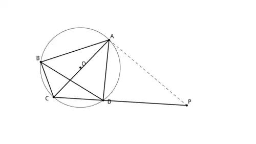 Seja, como na figura ao lado, um quadrilátero ABCD inscrito numa circunferência de centro O. Vamos provar que , isto é, provar que o produto das diagonais é igual a soma dos produtos dos lados opostos. Para isso, a partir do vértice A traçamos uma semirreta que intersecciona a semirreta num ponto P tal que. Dado que o quadrilátero ABCD é inscritível, podemos dizer que seus ângulos opostos são suplementares ( ver ). Assim, é verdade que é suplementar a . Da mesma maneira, temos que é suplementar a , o que segue daí que são iguais: . Assim, observe então que os triângulos BAC e DAP têm dois ângulos congruentes e podemos concluir que estes são semelhantes entre si pelo caso ângulo-ângulo (ver ). Disto é válido dizer que , que é o mesmo que . Como construímos que , segue que e, da semelhança de triângulos que acabamos de mostrar, que . Então, pelo caso lado-ângulo-lado de semelhança de triângulos (ver ), dizemos que os triângulos ABD e ACP são semelhantes. Por conseguinte, também podemos inferir disso que , que é o mesmo que . Mas perceba pela figura ao lado que . Substituindo tudo que já encontramos nessa expressão, teremos que . Resolvendo a expressão, podemos concluir então que, como queríamos.