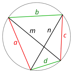 "O produto das diagonais é igual a soma dos produtos dos lados opostos". Isto é, sendo m e n suas diagonais, a,b,c e d seus lados, vale que: . Este teorema pode ser demonstrado da seguinte maneira: