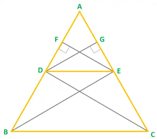 Este teorema defende que a ligação de dois pontos médios (neste caso D e E) de dois lados do triângulo (AB e AC) forma um segmento correspondente à metade do triângulo inicial (neste caso ABC).[25]