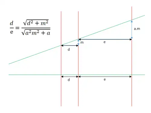 De uma forma mais simples: Nós aplicamos a mudança 'a' e é igual à razão 'e/d', ou seja 'e/d' é a razão de proporcionalidade em ambas as retas não paralelas. Dizendo por outras palavras, 'a' e 'e/d' são iguais, isto é, as 'mudanças' são iguais.[22]