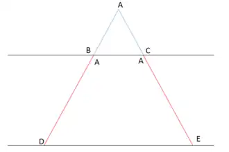 Isto deve-se ao facto de que (seguindo o teorema de Tales) temos retas transversais (AB e AC) e retas paralelas (DE e BC), além disso, AB=AD+DB e AC=AE+EC, ou seja: