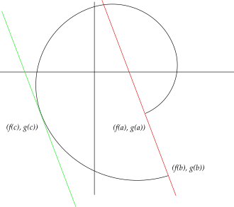 então o declive de recta definida por (f(a),g(a)) e por (f(b),g(b)) é igual ao declive da tangente à curva em algum ponto.