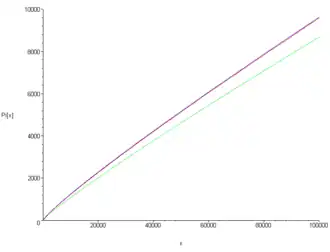 x π(x)[12] π(x) / (x / ln x) x / π(x) π(x) − x / ln x[13] Li(x) − π(x)[14] 10 4 0,921 2,500 −0,3 2,2 10² 25 1,151 4,000 3,3 5,1 10³ 168 1,161 5,952 23 10 104 1.229 1,132 8,137 143 17 105 9.592 1,104 10,425 906 38 106 78.498 1,084 12,740 6.116 130 107 664.579 1,071 15,047 44.158 339 108 5.761.455 1,061 17,357 332.774 754 109 50.847.534 1,054 19,667 2.592.592 1.701 1010 455.052.511 1,048 21,975 20.758.029 3.104 1011 4.118.054.813 1,043 24,283 169.923.159 11.588 1012 37.607.912.018 1,039 26,590 1.416.705.193 38.263 1013 346.065.536.839 1,034 28,896 11.992.858.452 108.971 1014 3.204.941.750.802 1,033 31,202 102.838.308.636 314.890 1015 29.844.570.422.669 1,031 33,507 891.604.962.452 1.052.619 1016 279.238.341.033.925 1,029 35,812 7.804.289.844.393 3.214.632 1017 2.623.557.157.654.233 1,027 38,116 68.883.734.693.281 7.956.589 1018 24.739.954.287.740.860 1,025 40,420 612.483.070.893.536 21.949.555 1019 234.057.667.276.344.607 1,024 42,725 5.481.624.169.369.960 99.877.775 1020 2.220.819.602.560.918.840 1,023 45,028 49.347.193.044.659.701 222.744.644 1021 21.127.269.486.018.731.928 1,022 47,332 446.579.871.578.168.707 597.394.254 1022 201.467.286.689.315.906.290 1,021 49,636 4.060.704.006.019.620.994 1.932.355.208 1023 1.925.320.391.606.818.006.727 1,020 51,939 37.083.513.766.592.669.113 7.236.148.412