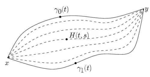 O I denota o intervalo de unidade . Uma família de mapas indexados por I, é chamado de homotopia de para E se é um mapa (por exemplo, deve ser uma função contínua). Quando X, Y são espaços baseados, então são necessários para preservar os pontos de base. Uma homotopia pode ser considerada uma relação de equivalência . Dado um espaço baseado em X e um inteiro , deixemos serem as classes de homotopia de mapas baseadas em de uma n -esfera (baseada) para X. Acontece que são grupos e, em particular, é chamado de grupo fundamental de X.