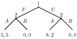 No jogo mostrado aqui, existem dois jogadores, Jogador 1 move primeiro escolhendo entre F ou U. O Jogador 2 vê o movimento do Jogador 1 e então escolhe entre A ou R. Suponha que o Jogador 1 escolha U e então o Jogador 2 escolha A, então o Jogador 1 obterá 8 e o Jogador 2 obterá 2.