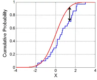 O teste de Kolmogorov–Smirnov para a qualidade do ajuste é construído pelo uso de valores críticos da distribuição de Kolmogorov.[7] A hipótese nula é rejeitada no nível se