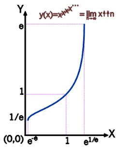 Como o limite y = ∞x (se existente, ou seja, para e−e < x < e1/e) deve satisfazer xy = y, vemos que x ↦ y = ∞x é (o menor ramo) da função inversa de y ↦ x = y1/y.
