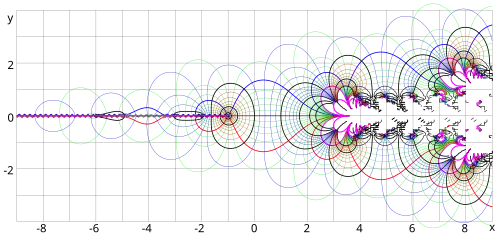 Resolvendo a relação inversa como na seção anterior, retorna o esperado e , com valores negativos de n dando infinitos resultados sobre o eixo imaginário. Plotados no plano complexo, a sequência inteira espiraliza até o limite de , o que poderia ser interpretado como o valor onde n é infinito.