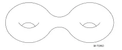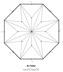 Podemos também triangularizar o bitoro, que é uma soma conexa de dois toros, triangularizando a região poligonal que o representa, que é um polígono com uma orientação nas arestas. Esta orientação determina como as arestas devem ser coladas para formar a figura topológica.[1] Uma possível triangulação do bitoro é dada pela figura abaixo: