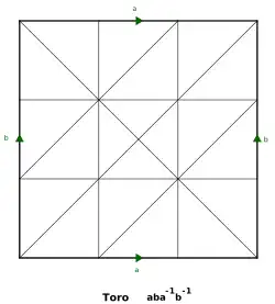 O toro é uma superfície topológica compacta, conexa e orientável, que pode ser representada por um polígono (no caso, quadrado) com uma orientação nas arestas. Esta orientação representa a identificação das arestas. Uma possível triangulação do toro é dada pela figura abaixo, na qual o toro é representado pelo quadrado com os lados identificados [1] .