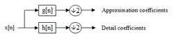 A maneira mais comum de se calcular a transformada discreta de wavelet é através da aplicação de bancos de filtros onde o filtro determinado pelos coeficientes corresponde a um filtro passa-altas e o filtro a um filtro passa-baixas (conforme imagem ao lado).