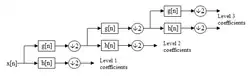 A decomposição com o filtro acima decompõe o sinal em apenas duas faixas de freqüência. Podemos encadear uma série de bancos de filtros, usando a operação de sub-amostragem para proporcionar a divisão da freqüência de amostragem por 2 (como visto na figura ao lado) a cada novo banco de filtros encadeado.