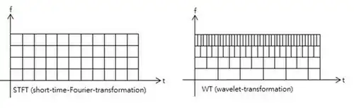 Em outras palavras, a função básica pode ser considerada como uma resposta ao impulso de um sistema com o qual a função foi filtrada. O sinal transformado fornece informações sobre o tempo e a frequência. Portanto, a transformada wavelet contém informações semelhantes à transformação de Fourier de curto prazo (STFT, ou Short-Time-Fourier-Transformation, em inglês), porém com propriedades especiais adicionais das onduletas. Essas propriedades aparecem na resolução temporal em frequências de análise mais altas da função-base. A diferença na resolução de tempo em frequências crescentes para a transformada de Fourier e a transformada wavelet é mostrada abaixo. Observe, entretanto, que a resolução da frequência está diminuindo para frequências crescentes, enquanto a resolução temporal aumenta. Esta consequência do princípio da incerteza de Fourier não é exibida corretamente na Figura.