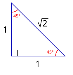 Em geometria plana, a construção da diagonal de um quadrado resulta em um triângulo cujos três ângulos tem a razão 1 : 1 : 2, formando no total 180° ou radianos. Assim, os ângulos tem respectivamente 45° (/4), 45° (/4) e 90° (/2). Os lados deste triângulo estão na razão 1 : 1 : √2, que segue imediatamente do teorema de Pitágoras.