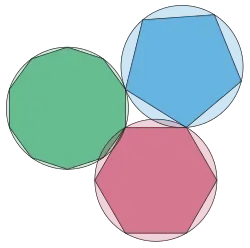 Seja o comprimento do lado de um decágono regular inscrito no círculo unitário, onde φ é a proporção áurea. Seja o comprimento do lado de um hexágono regular no círculo unitário, e o comprimento do lado de um pentágono regular no círculo unitário. Então a2 + b2 = c2, e assim estes três comprimentos formam os lados de um triângulo retângulo.[9] O mesmo triângulo forma a metade de um retângulo de ouro. O mesmo pode ser também encontrado dentro de um icosaedro regular com lado de comprimento c: o segmento de reta mais curto de qualquer vérticeV ao plano de seus cinco vizinhos tem comprimento a, e os pontos extremos deste segmento de linha juntamente com quaisquer vizinhos de V formam os vértices de um triângulo retângulo com lados a, b e c.[10]