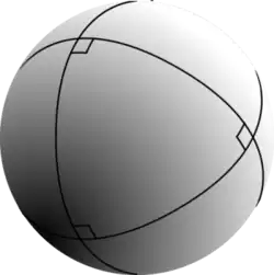 O triângulo esférico com pelo menos um ângulo reto se denomina triângulo retângulo. Em um triângulo esférico seus três ângulos podem ser retos, em cujo caso, a soma é 270°. Em todos os outros casos essa soma excede os 180° e a esse excesso se denomina excesso esférico; se expressa pela fórmula: E: E = ++ - 180°.
