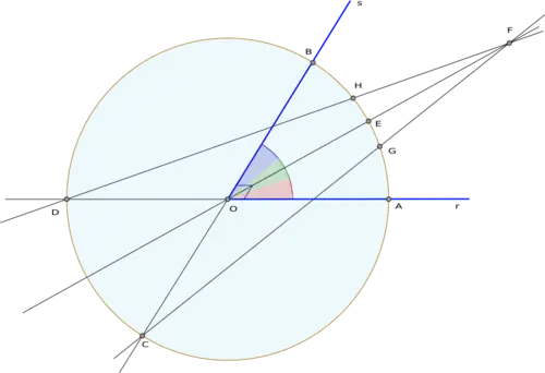 Considerando ∠AOB = 2a e ∠HOG = 2x, verifica-se que no triângulo ΔOCF temos que o ângulo ∠OCF = ½(a + x) pois é um ângulo inscrito na circunferência que compreende um arco de medida a + x, e também temos que ∠CFO = ½(a − x) pois ao prolongarmos a bissetriz obtemos um ângulo oposto ao ângulo ∠EOB = a pelo vértice, que por outro lado, ele é ângulo externo ao triângulo ΔOCF não adjacente aos ângulos ∠OCF = ½(a + x) e ∠CFO, então: