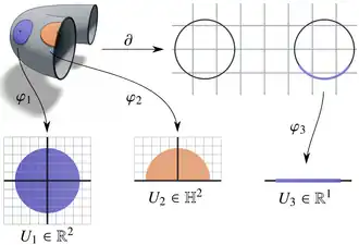 Uma 2-variedade suave: o cartograma interior com mapa de transição φ1 mapeia um subconjunto aberto em torno de um ponto interior para um subconjunto euclidiano aberto, enquanto o cartograma de fronteira com mapa de transição φ2 mapeia um subconjunto fechado em torno de um ponto de fronteira para um subconjunto euclidiano fechado. A própria fronteira é uma 1-variedade sem fronteira, portanto o cartograma com mapa de transição φ3 deve mapear para um subconjunto euclidiano aberto.