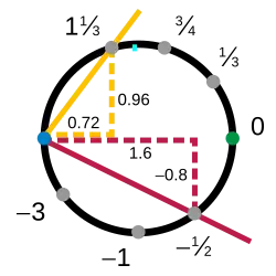 Os cartogramas do topo e da direita, e respectivamente, se sobrepõem em seus domínios: sua interseção está no quarto do círculo onde tanto as coordenadas quanto são positivas. Ambos mapeiam essa parte para o intervalo , embora de formas diferentes. Assim, pode-se construir uma função , que toma valores do contradomínio de de volta ao círculo usando a inversa, seguida de de volta ao intervalo. Se a é qualquer número em , então: