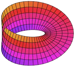 Comece com um cilindro circular infinito posicionado verticalmente, uma variedade sem fronteira. Fatie-o transversalmente em cima e embaixo para produzir duas fronteiras circulares e a faixa cilíndrica entre elas. Esta é uma variedade orientável com fronteira, sobre a qual uma "cirurgia" será realizada. Corte a faixa para abri-la, de modo que ela possa se desenrolar para se tornar um retângulo, mas segure as extremidades cortadas. Torça uma extremidade em 180°, fazendo a superfície interna voltar-se para fora, e cole as extremidades novamente de forma contínua. Isso resulta em uma faixa com uma meia torção permanente: a faixa de Möbius. A sua fronteira já não é um par de círculos, mas (topologicamente) um único círculo; e o que antes era o seu "lado de dentro" fundiu-se com o seu "lado de fora", de modo que agora possui apenas um único lado. Semelhantemente à garrafa de Klein abaixo, esta superfície bidimensional precisaria interceptar a si mesma em duas dimensões, mas pode ser facilmente construída em três ou mais dimensões.