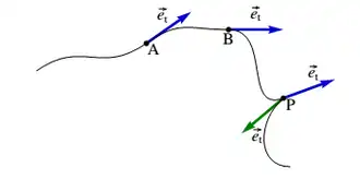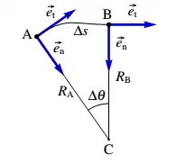 Em cada ponto de uma trajetória pode definir-se um versor tangencial na direção tangente à trajetória e no sentido do movimento. A figura abaixo mostra o versor tangencial em três pontos A, B e P de uma trajetória.[2]