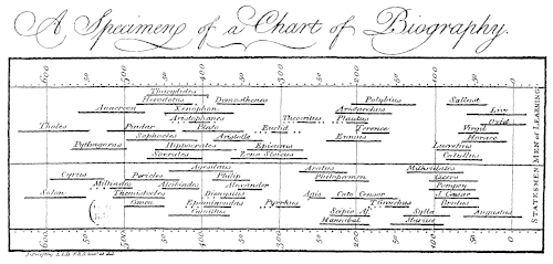 Duas décadas antes das primeiras realizações de Playfair, em 1765 Joseph Priestley criou a inovação dos primeiros gráficos de linha do tempo, nos quais barras individuais eram usadas para visualizar a expectativa de vida de uma pessoa, e o todo pode ser usado para comparar a expectativa de vida de várias pessoas. De acordo com James R. Beniger e Robyn (1978) "as linhas do tempo de Priestley provaram ser um sucesso comercial e uma sensação popular, e passaram por dezenas de edições".[5]
