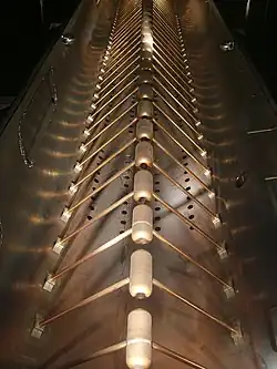 Os diferentes comprimentos dos tubos refletem o fato das partículas pesadas terem sua velocidade aumentada lentamente. Na figura 3 é apresentado uma foto de uma estrutura deste tipo.