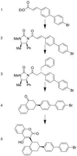 Brodifacoum é um derivado do grupo 4-hidroxicumarina. Os números dos compostos são encontrados ao lado de seus respectivos compostos na imagem abaixo. O composto 1 é o éster de partida necessário para sintetizar o brodifacoum. Para obter este composto 1 de partida, é realizada uma simples condensação Wittig de cloroacetato de etilo com 4'-bromobifenilcarboxaldeído. O composto 1 é transformado no composto 2 por hidrólise consecutiva, halogenação para formar um cloreto de ácido e então reagido com o ânion de lítio necessário. Isso é feito usando KOH e EtOH para hidrólise e, em seguida, adicionando SOCl 2 para cloração para formar o cloreto de ácido que reage com a adição de ânion de lítio. O composto 2 é então transformado usando química de organocobre para produzir o composto 3 com boa estereosseletividade de cerca de 98%. Normalmente, uma ciclização do tipo Friedel-Crafts seria então usada para obter a porção do sistema de dois anéis do composto 4, mas isso resulta em baixo rendimento. Em vez disso, o ácido trifluorometanossulfônico em benzeno seco catalisa a ciclização com bom rendimento. A cetona é então reduzida com borohidreto de sódio produzindo um álcool benzílico . A condensação com 4-hidroxicumarina sob HCl produz o composto 5, brodifacoum.[3]