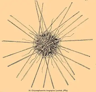 Chrysosphaerella longispina, formando uma colónia esférica.