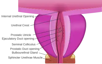 Dissecção da próstata mostrando a uretra prostática e a crista uretral na parede posterior.