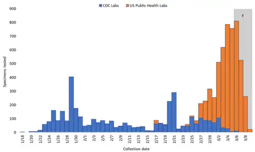 Os laboratórios comerciais dos Estados Unidos também começaram a realizar os testes. Em 5 de março de 2020, a LabCorp anunciou a disponibilidade nacional de testes de COVID-19 com base na RT-PCR.[11][12] A Quest Diagnostics disponibilizou, similarmente, o teste nacional de COVID-19 em 9 de março de 2020. Nenhuma limitação de quantidade de realização dos testes foi estipulada; a coleta e o processamento das amostras devem ser realizadas de acordo com os requisitos dos Centros de Controle de Doenças e Prevenção.[13]