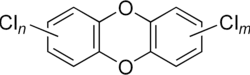Em PCDDs, os átomos de cloro são ligados a esta estrutura em quaisquer de 8 diferentes lugares na molécula, nas posições 1–4 e 6–9. Existem 75 diferentes tipos de congêneres PCDD (isto é: compostos relacionados ao conceito de dioxina).[6]