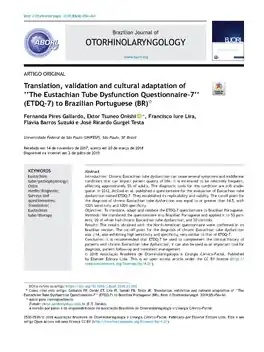 - ↑ a b c d e f Gallardo, Fernanda Pires; Onishi, Ektor Tsuneo; Lira, Francisco Iure; Suzuki, Flávia Barros; Testa, José Ricardo Gurgel (1 de julho de 2019). «Translation, validation and cultural adaptation of "The Eustachian Tube Dysfunction Questionnaire-7" (ETDQ-7) to Brazilian Portuguese (BR)». Brazilian Journal of Otorhinolaryngology (em inglês) (4): 456–464. ISSN 1808-8694. doi:10.1016/j.bjorl.2018.03.010. Consultado em 26 de julho de 2022