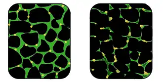 | Em comparação com músculo normal (à esquerda), no músculo afetado (à direita) o tecido encontra-se-se desorganizado e a concentração de distrofina (a verde) bastante diminuída | |