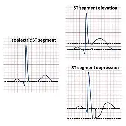 A elevação do ST pode indicar infarto do miocárdio transmural. Uma elevação de > 1 mm e mais de 80 ms após o ponto J. Esta medida tem uma taxa de falsos positivos de 15-20% (que é ligeiramente mais alta nas mulheres do que nos homens) e uma taxa de falsos negativos de 20-30%.[1]
