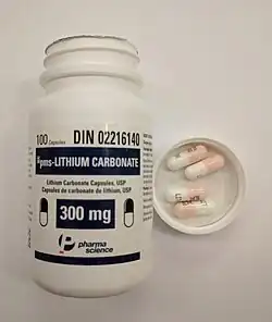 - Lítio – o lítio é descrito como o estabilizador de humor "clássico", pois foi o primeiro a ser aprovado pela Food and Drug Administration (FDA) e ainda continua popular. O monitoramento desse medicamento é necessário para garantir que os níveis de lítio permaneçam na faixa terapêutica, que varia de 0,6 a 0,8-1,2 mEq/L. Os sinais e sintomas de toxicidade incluem náuseas, vômitos, diarreia e ataxia.[3] Os efeitos colaterais mais comuns são letargia e ganho de peso. Os efeitos colaterais menos comuns são visão turva, um leve tremor e uma sensação de mal estar. Em geral, esses efeitos colaterais ocorrem nas primeiras semanas após o início do tratamento com lítio. Geralmente, os sintomas podem ser melhorados com a redução da dose ou com tempo de adaptação à dose atual.[4]