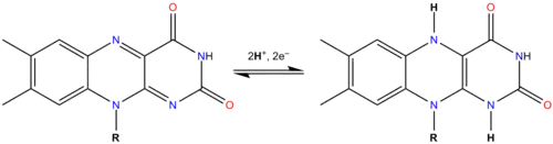 em que Flox é a forma oxidada, FlredH2 a reduzida (tendo aceite dois átomos de hidrogénio) e FlH• a forma semiquinona (radical, um átomo de hidrogénio adicionado).