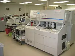 Muitos espécimes acabam em um ou mais analisadores automatizados sofisticados, que processam uma fração da amostra para retornar um ou mais resultados de teste. Alguns laboratórios usam manipuladores de amostras robóticas ( automação de laboratório ) para otimizar o fluxo de trabalho e reduzir o risco de contaminação do manuseio da amostra pela equipe.