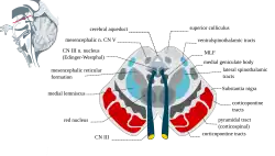 O mesencéfalo, analisado através de um corte transversal, pode ser dividido em três regiões:[3]