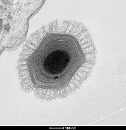 - ↑ Shinn GL, Bullard BL (19 de setembro de 2018). San Martin, Carmen, ed. «Ultrastructure of Meelsvirus: A nuclear vírus of arrow worms (phylum Chaetognatha) producing giant "tailed" virions». PLOS ONE. 13 (9): e0203282. Bibcode:2018PLoSO..1303282S. PMC 6145532