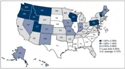 Nos estados do sudeste, como Texas, Carolina do Norte, Connecticut, Delaware, Distrito de Colúmbia, Illinois, Massachusetts, Nebraska, Nova Jérsei, Rhode Island, Dakota do Sul e Virgínia Ocidental, o percentual foi mais baixo, apenas 0,50%.