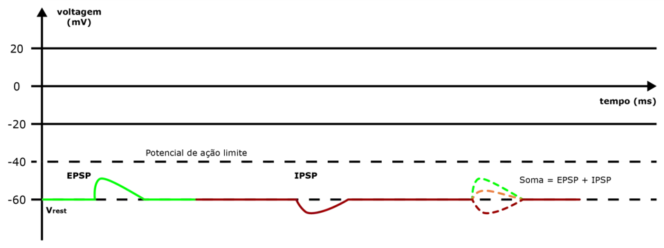 Esse sistema[1] de IPSPs pode ser temporariamente somado com EPSPs acima ou abaixo do limite para reduzir a amplitude do potencial pós-sináptico resultante. EPSPs equivalentes (positivos) e IPSPs (negativos) podem anular-se mutuamente quando somados. O equilíbrio entre os EPSPs e IPSPs é muito importante para a integração de informação elétrica produzida por sinapses inibitórias e excitatórias.