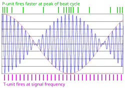Quando a frequência do estímulo e a frequência de descarga estão próximas uma da outra, as duas ondas de amplitude-tempo sofrem interferência, e os órgãos eletrorreceptores percebem uma única onda com uma frequência intermediária. Além disso, a onda combinada estímulo-EOD tem um padrão de batimento, com a frequência do batimento igual à diferença de frequência entre o estímulo e o EOD.[10]