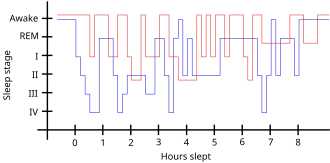| Padrão de sono de pessoa com síndrome das pernas inquietas (vermelho) e de pessoa com padrão de sono saudável (azul). | |