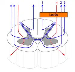 Trato lesado Trato espinotalâmico (ascendente) Fascículos grácil e cuneiforme do sistema coluna dorsal-lemnisco medial (ascendentes) Trato espinocerebelar (ascendente) Trato corticoespinhal (descendente) Feixe simpático (descendente)