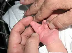 Sindactilia é uma anormalidade embriológica que resulta na visível união entre dois ou mais dedos das mãos ou dos pés. A fusão ocorre tanto em partes moles, de fácil intervenção cirúrgica, como fusão óssea (sinostose). No primeiro caso, denominado sindactilia cutânea, não há degeneração da membrana existente entre os dedos, que normalmente ocorreria por apoptose. No segundo caso, a não separação dos ossos dos dedos (nesta etapa, chamados "raios digitais") acontece quando as depressões entre eles não se formam.[1] Existem classificações diferenciadas das mãos podendo haver fusão óssea de dois ou mais dedos. Pode ser importante a rapidez da cirurgia, no caso das mãos, pois pode atrapalhar o crescimento de cada dedo havendo a possibilidade de deformidades angulares e perda de amplitude de movimento dos dedos.[carece de fontes]