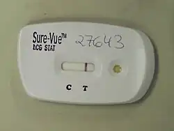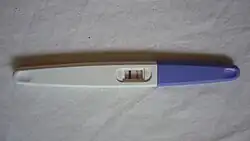 Outro kit de teste de gravidez caseiro foi baseado no trabalho de Judith Vaitukaitis e Glenn Braunstein, que desenvolveram um ensaio sensível de hCG no Instituto Nacional de Saúde dos Estados Unidos.[44][45] Esse teste chegou ao mercado em 1978.[46] Na década de 1970, a descoberta dos anticorpos monoclonais levou ao desenvolvimento de imunoensaios relativamente simples e baratos, como testes baseados em inibição por aglutinação e ELISA sanduíche, usados em testes caseiros modernos de gravidez. Os testes agora são tão baratos que podem ser produzidos em massa e usados até em publicidade.[47]